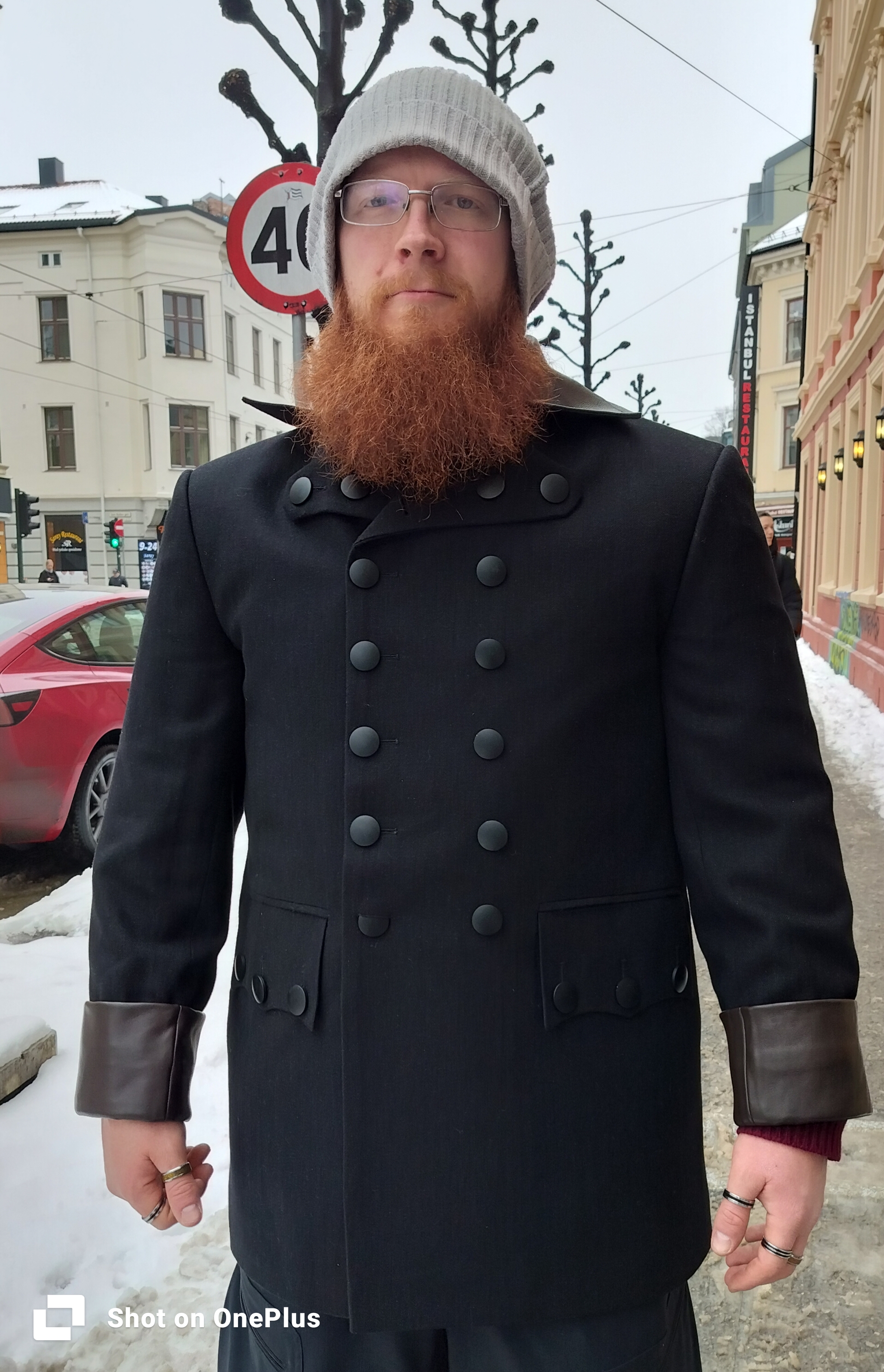 Storfornøyd svenske nettopp ferdig med fitting av sin fine sjakett i merino ull.
